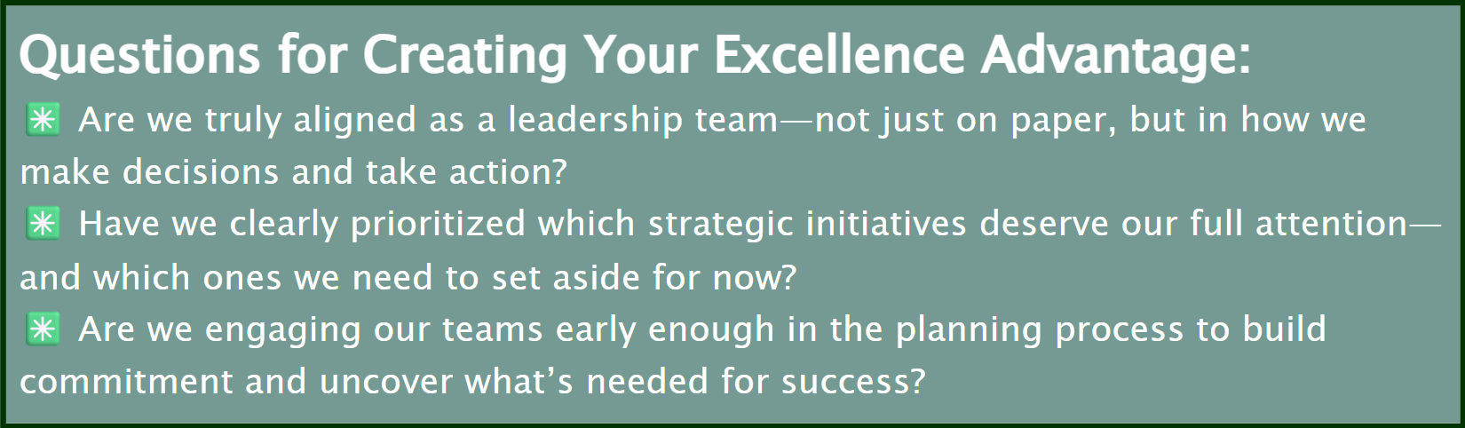 Strategic measures don’t just track outcomes—they become a hardwired communication system that reinforces what matters. Align your measurement systems to your goals so that data—not assumptions—drives your decisions. Routinely ask: Are we making progress? If not, why not?