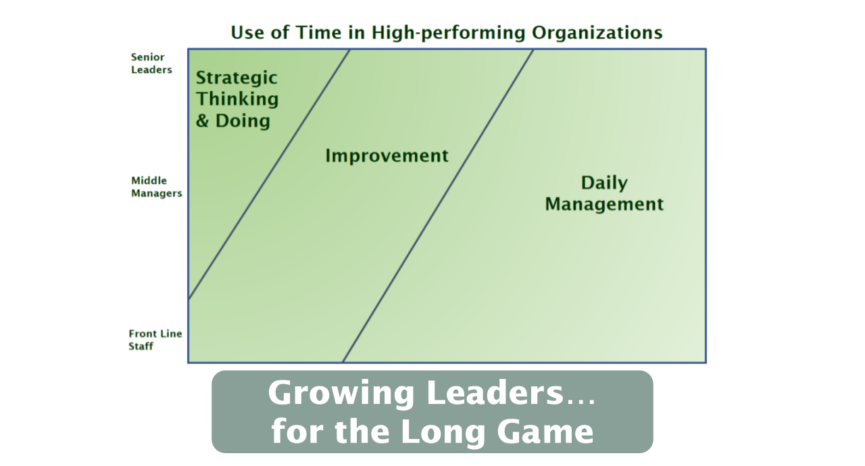 In a previous piece, I described how leaders in high-performing organizations distribute their time across three domains: Strategic Thinking & DoingImprovement, and Daily Management. Senior leaders devote roughly a third of their time to each. And middle managers, substantial time but in different proportions. The opening image shows this visually. [Note: At the end of this article, you’ll find a link to my prior article on this: the Use of Time in high-performing organizations].